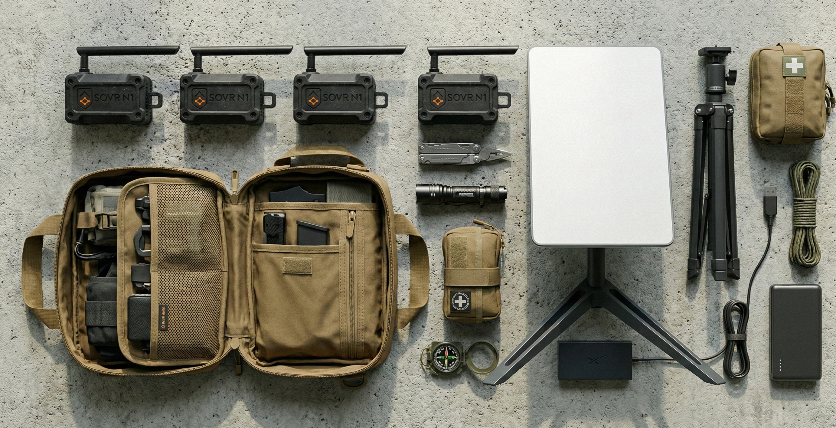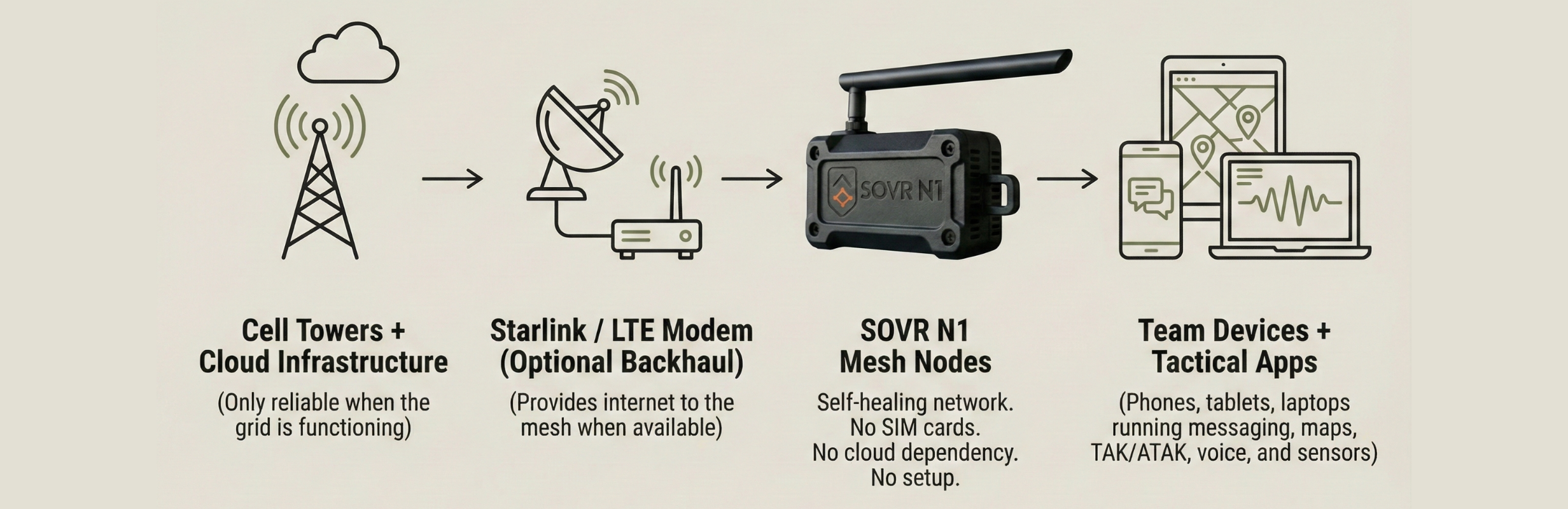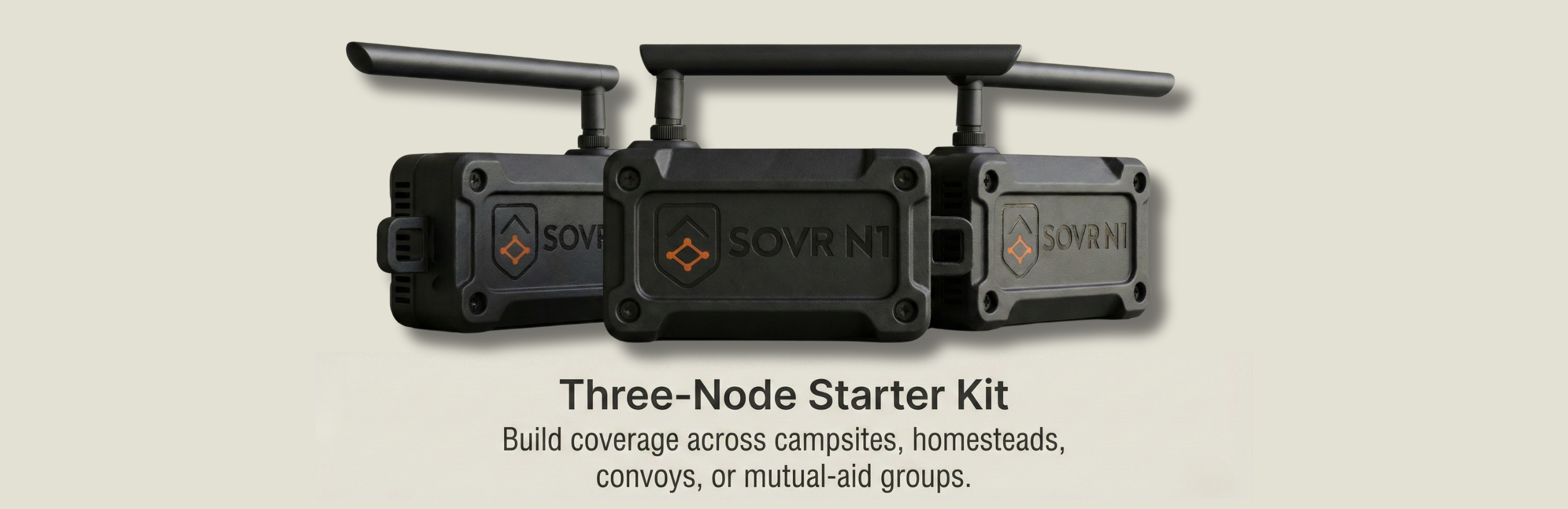 Why SOVR N1: Nodes act as relays or gateways — extend the mesh across the convoy and feed it with Starlink from the lead vehicle.